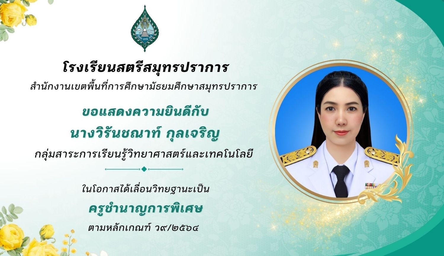 โรงเรียนสตรีสมุทรปราการ ขอแสดงความยินดีกับ นางวิรันชณาท์ กุลเจริญ เนื่องในโอกาสได้เลื่อนวิทยฐานะเป็น ครูชำนาญการพิเศษ