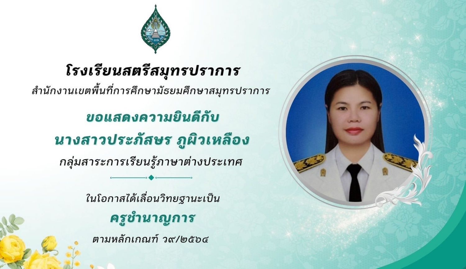 โรงเรียนสตรีสมุทรปราการ ขอแสดงความยินดีกับ นางสาวประภัสษร ภูผิวเหลือง เนื่องในโอกาสได้เลื่อนวิทยฐานะเป็น ครูชำนาญการ กลุ่มสาระการเรียนรู้ภาษาต่างประเทศ