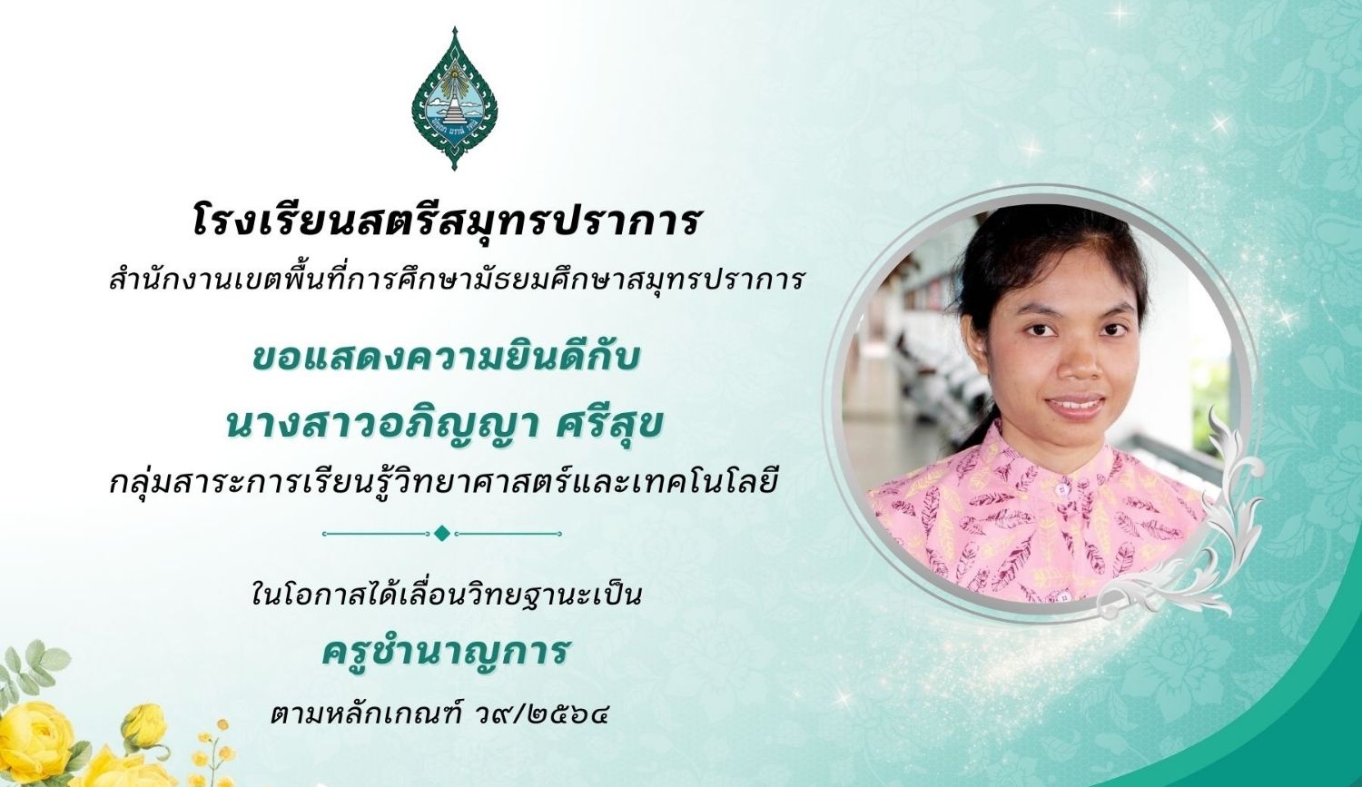 โรงเรียนสตรีสมุทรปราการ ขอแสดงความยินดีกับ นางสาวอภิญญา ศรีสุข เนื่องในโอกาสได้เลื่อนวิทยฐานะเป็น ครูชำนาญการ