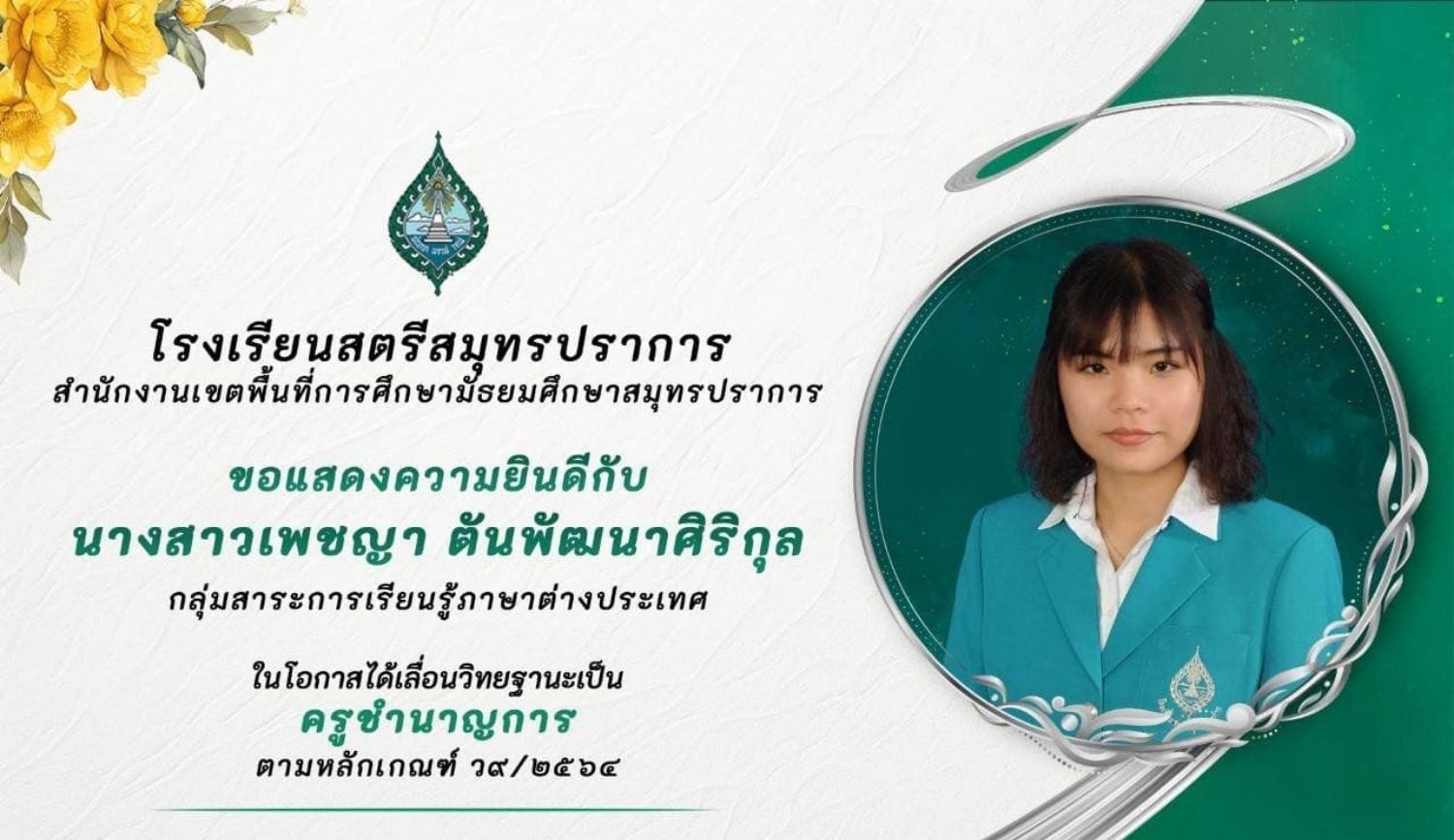 โรงเรียนสตรีสมุทรปราการ ขอแสดงความยินดีกับ นางสาวเพชญา ตันพัฒนาศิริกุล เนื่องในโอกาสได้เลื่อนวิทยฐานะเป็น ครูชำนาญการ กลุ่มสาระการเรียนรู้ภาษาต่างประเทศ