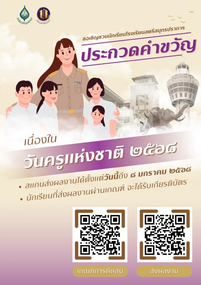 - เชิญชวนนักเรียนทุกระดับชั้น ส่งผลงาน ประกวดคำขวัญวันครูแห่งชาติ ประจำปี พ.ศ. 2568 คำขวัญที่ชนะเลิศ จะได้รับการประกาศเป็นคำขวัญประจำสถานศึกษา ศึกษาเกณฑ์การประกวดเพิ่มเติม ทาง QR Code ประชาสัมพันธ์ นักเรียนที่ส่งผลงานทุกคน ผ่านเกณฑ์ จะได้รับเกียรติบัตรออนไลน์