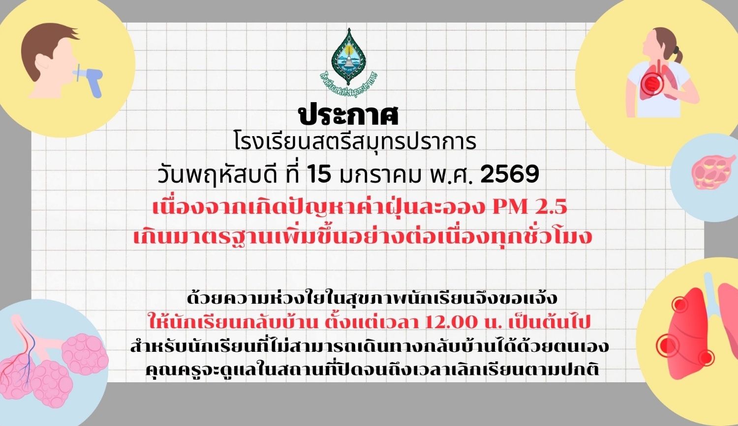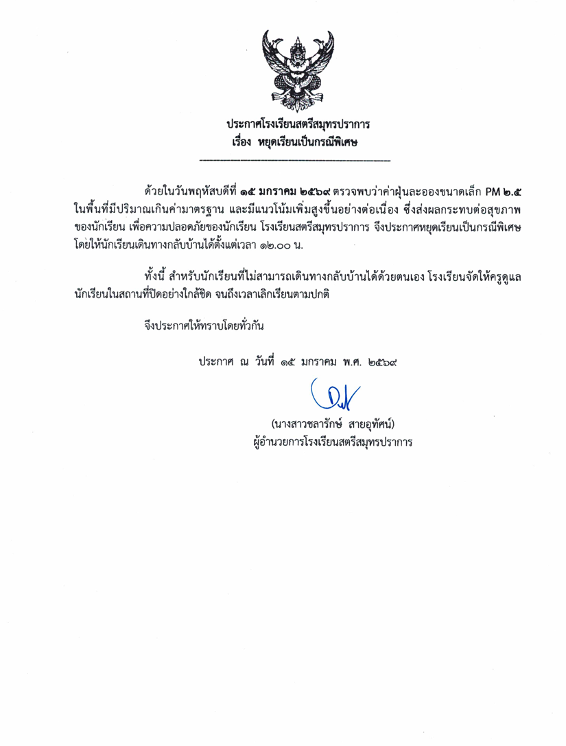 ประกาศโรงเรียนสตรีสมุทรปราการ หยุดเรียนกรณีพิเศษ ในวันพฤหัสบดีที่ 15 มกราคม พ.ศ. 2569 เนื่องจากเกิดปัญหาค่าฝุ่นละออง PM 2.5 เกินมาตรฐานเพิ่มขึ้นอย่างต่อเนื่องทุกชั่วโมง ด้วยความห่วงใยในสุขภาพของนักเรียน จึงขอแจ้งให้นักเรียนกลับบ้าน ตั้งแต่เวลา 12.00 น. เป็นต้นไป