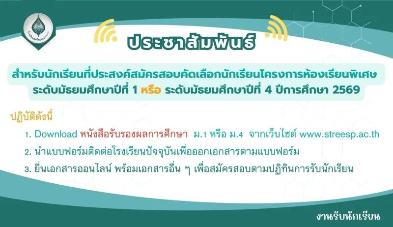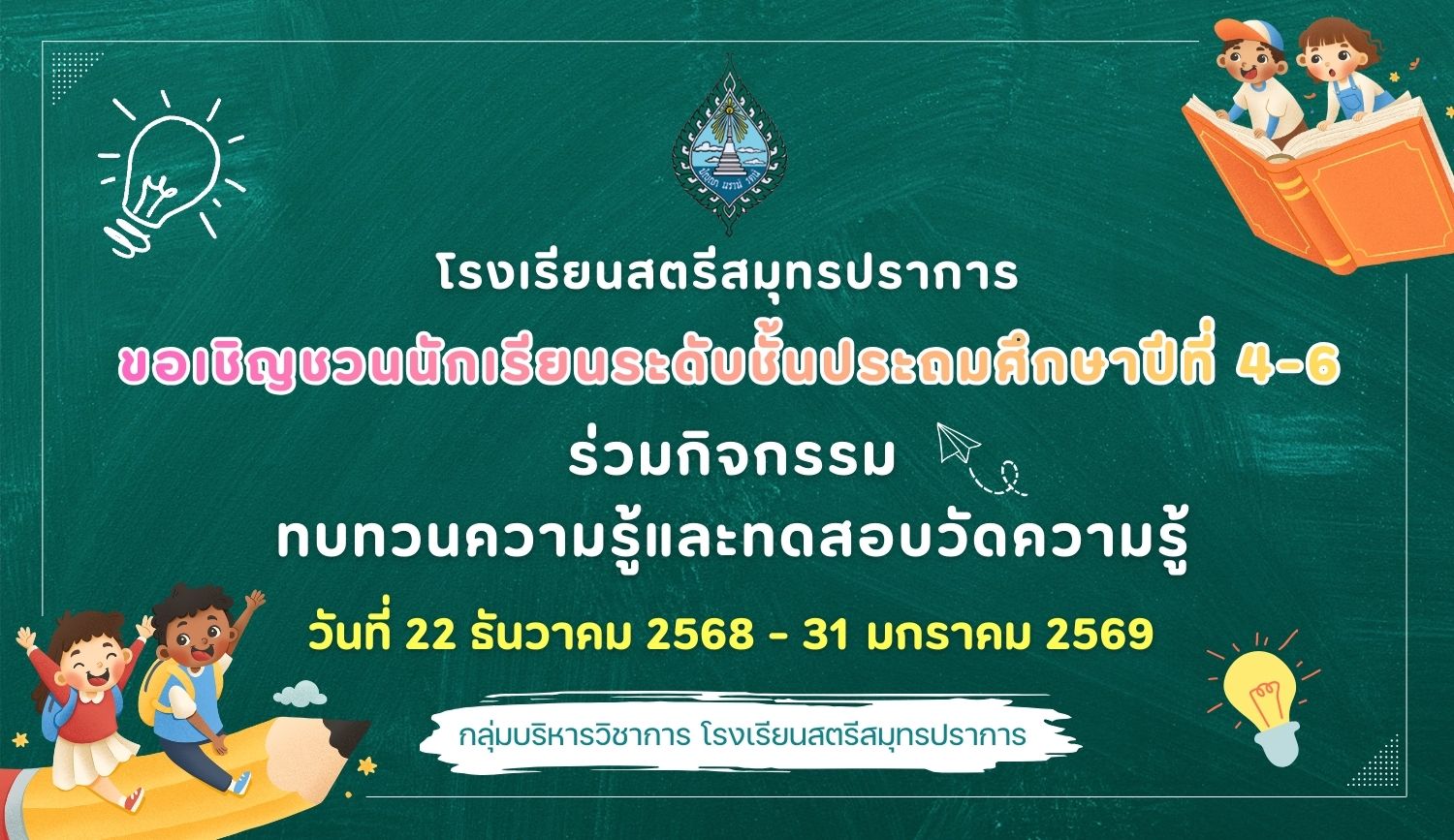 โรงเรียนสตรีสมุทรปราการ ขอเชิญชวนนักเรียนระดับชั้นประถมศึกษาปีที่ 4-6 ร่วมกิจกรรมทบทวนความรู้และทดสอบความรู้ ระหว่างวันที่ 22 ธันวาคม 2568 - 31 มกราคม 2569