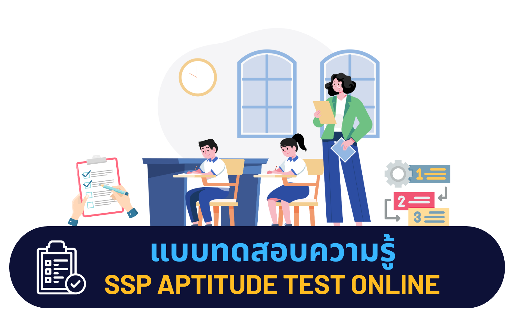 คำชี้แจง ให้นักเรียนทบทวนความรู้จากคลิปการสอน จำนวน 5 วิชา และทำแบบทดสอบ SSP Aptitude Test ผ่านระบบออนไลน์ จำนวน 50 ข้อ นักเรียนที่ทดสอบผ่านเกณฑ์ร้อยละ 60 จะได้รับเกียรติบัตร