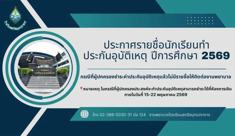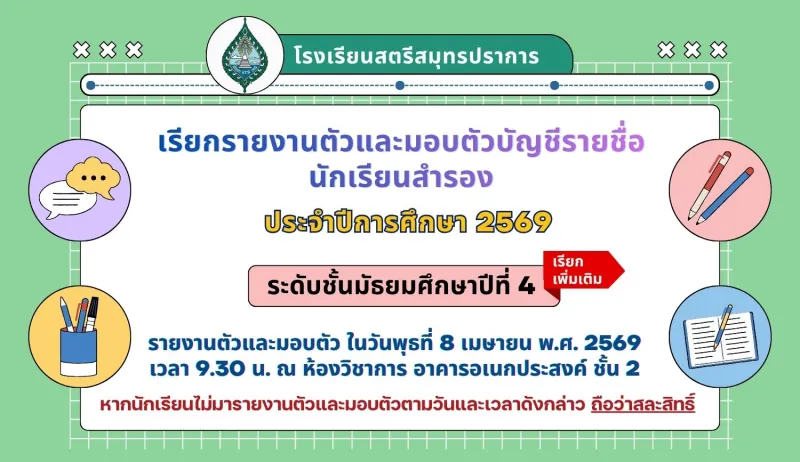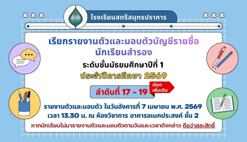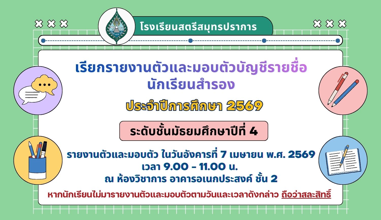 โรงเรียนสตรีสมุทรปราการ เรียกรายงานตัวและมอบตัวบัญชีรายชื่อนักเรียนสำรอง ชั้นมัธยมศึกษาปีที่ 4 ปีการศึกษา 2569