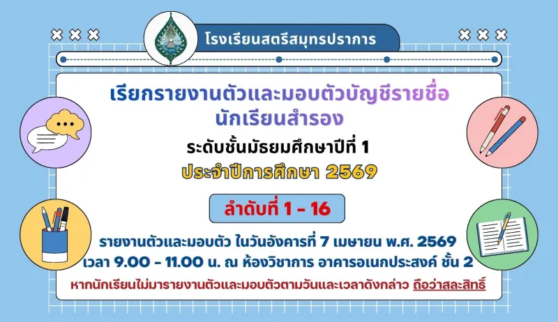 ให้นักเรียนมารายงานตัวและมอบตัวในวันอังคารที่ 7 เมษายน พ.ศ. 2569 เวลา 9.00 - 11.00 น. ณ ห้องวิชาการ อาคารอเนกประสงค์ ชั้น 2 โรงเรียนสตรีสมุทรปราการ หากนักเรียนไม่มารายงานตัวและมอบตัวตามวันและเวลาดังกล่าว ถือว่าสละสิทธิ์