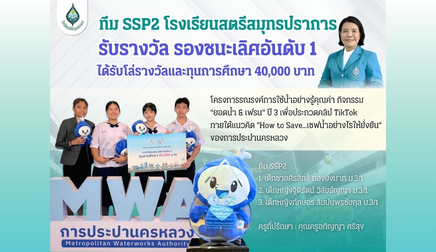 ขอแสดงความยินดีกับ ทีม SSP2 ได้รับรางวัลรองชนะเลิศ อันดับ 1 พร้อมโล่รางวัลและทุนการศึกษา จำนวน 40,000 บาท กิจกรรม "ยอดน้ำ & เฟรนด์" ปี 3 เพื่อประกวดคลิป TikTok ภายใต้แนวคิด "How to Save...เซฟน้ำอย่างไรให้ยั่งยืน" โครงการรณรงค์การใช้น้ำอย่างคุ้มค่า ของการประปานครหลวง