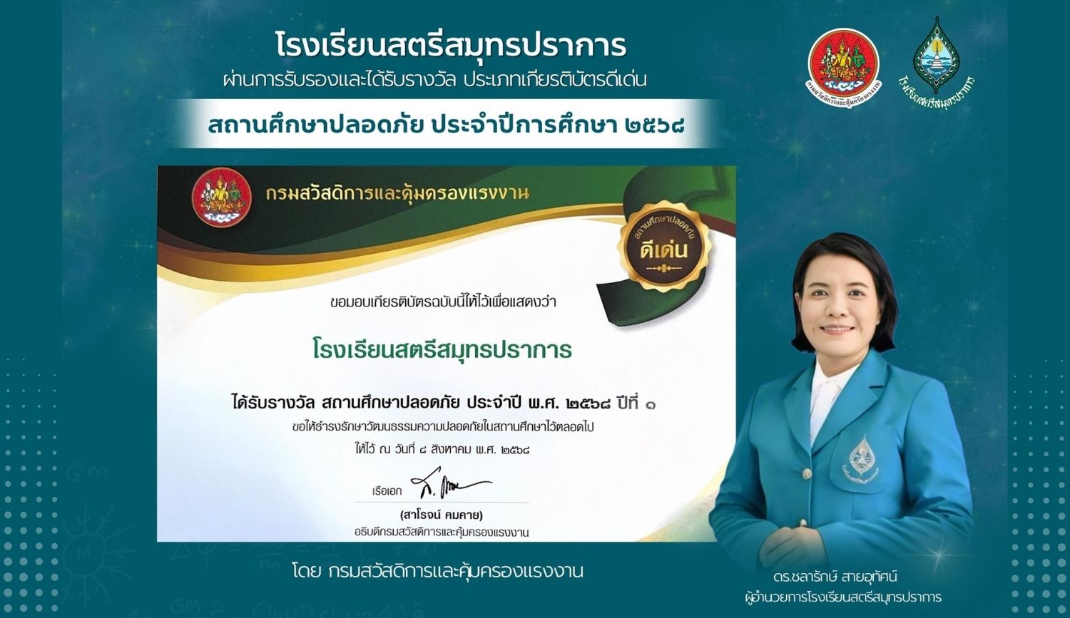 โรงเรียนสตรีสมุทรปราการ ผ่านการรับรองและได้รับรางวัลสถานศึกษาปลอดภัย ประจำปี พ.ศ. 2568 โดย กรมสวัสดิการและคุ้มครองแรงงาน