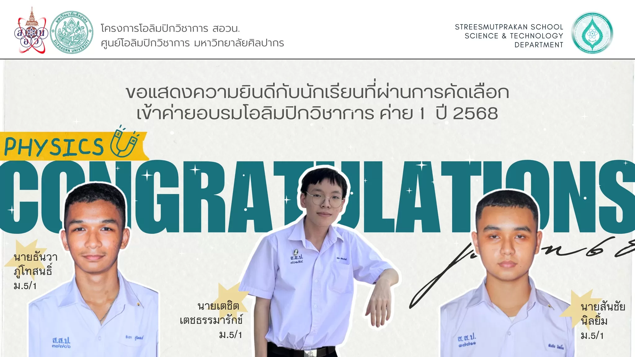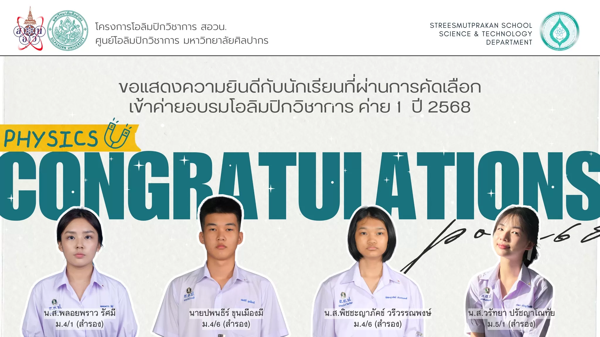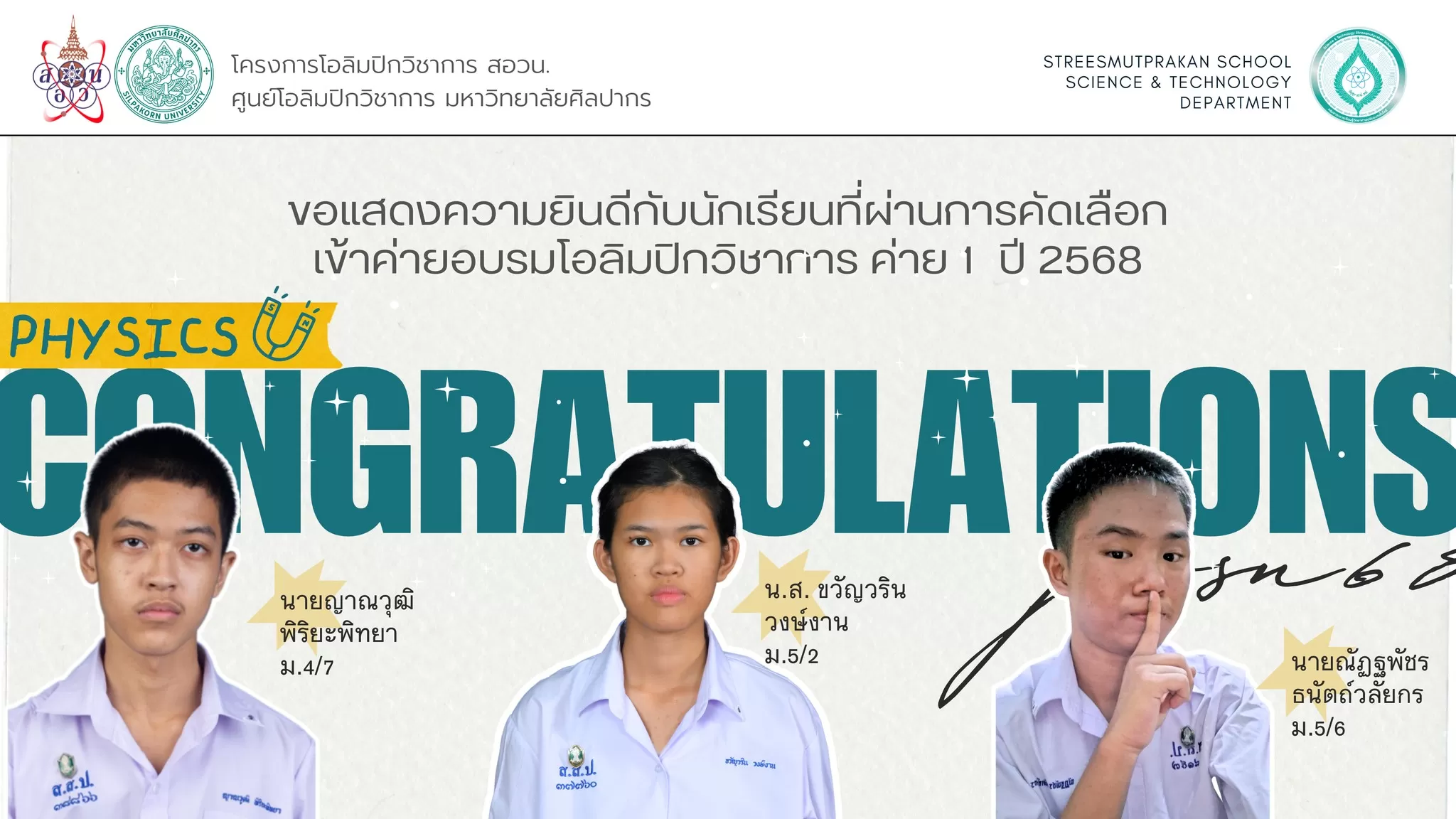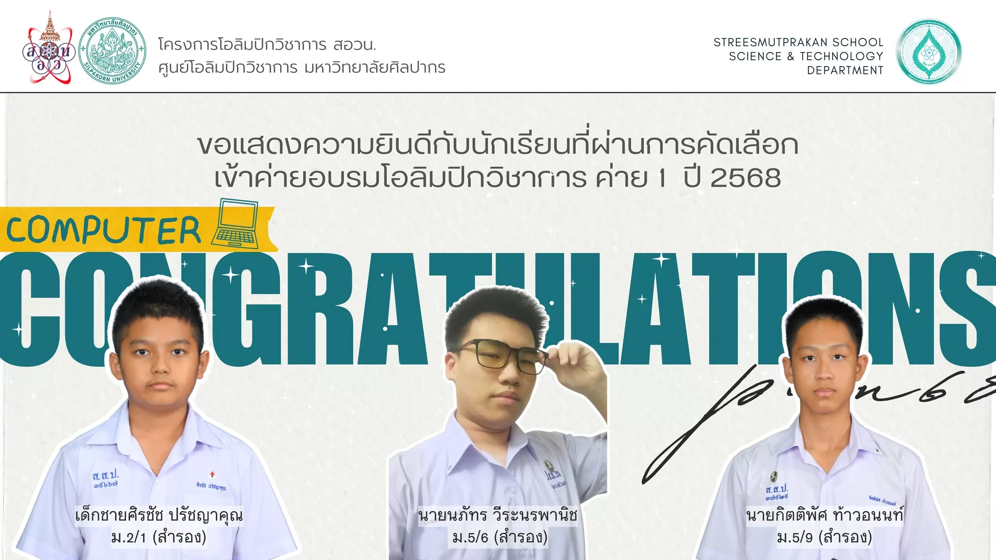 โรงเรียนสตรีสมุทรปราการ ขอแสดงความยินดีกับนักเรียนที่สอบผ่านการคัดเลือกเข้าค่ายอบรมโอลิมปิกวิชาการ ค่าย 1 ปีการศึกษา 2568