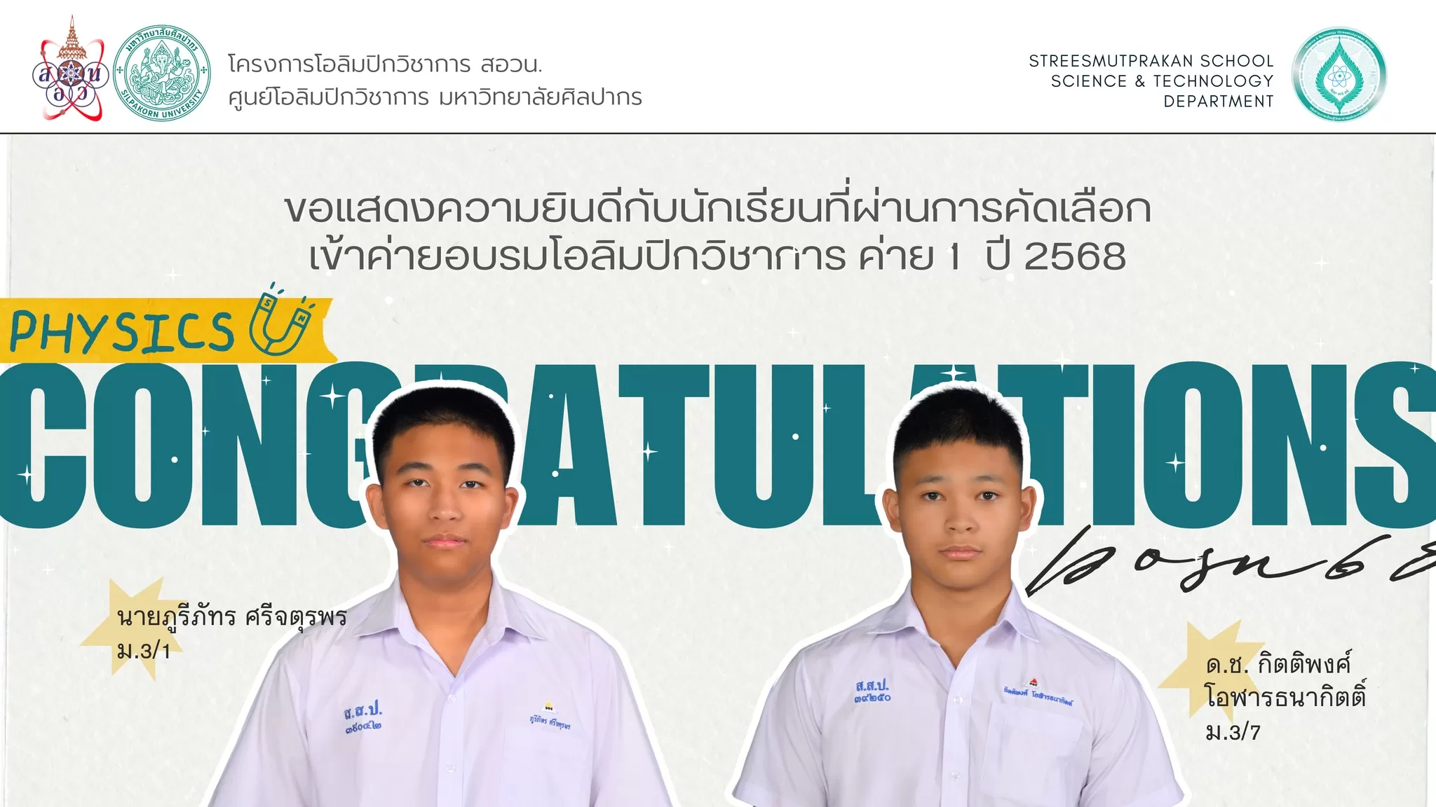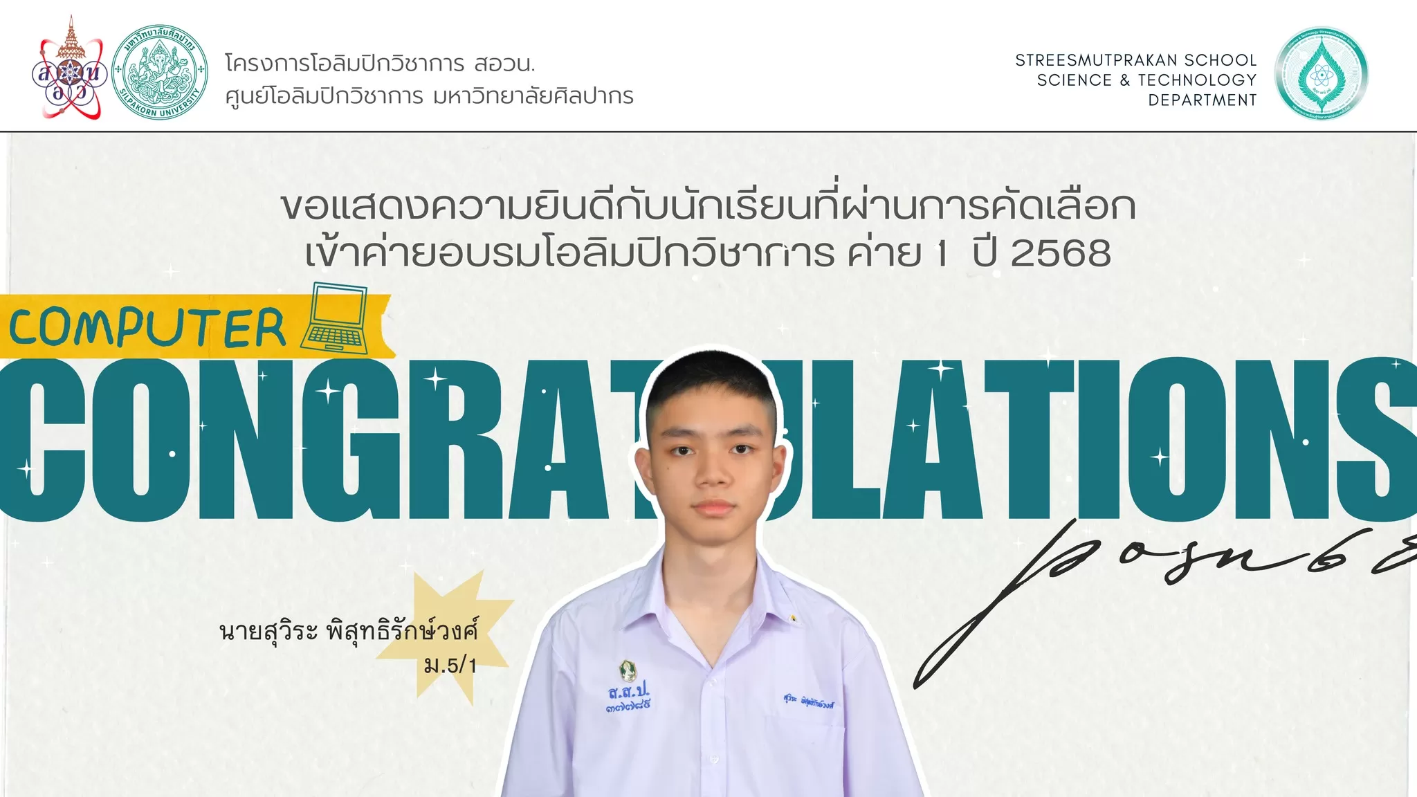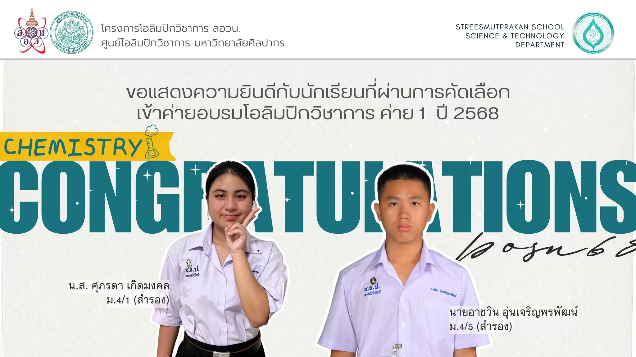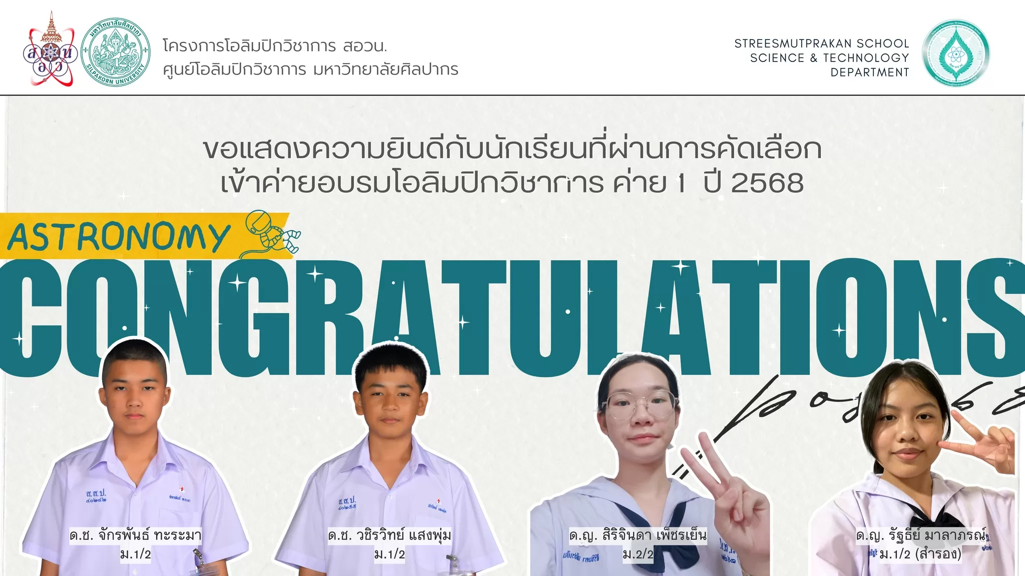 โรงเรียนสตรีสมุทรปราการ ขอแสดงความยินดีกับนักเรียนที่สอบผ่านการคัดเลือกเข้าค่ายอบรมโอลิมปิกวิชาการ ค่าย 1 ปีการศึกษา 2568